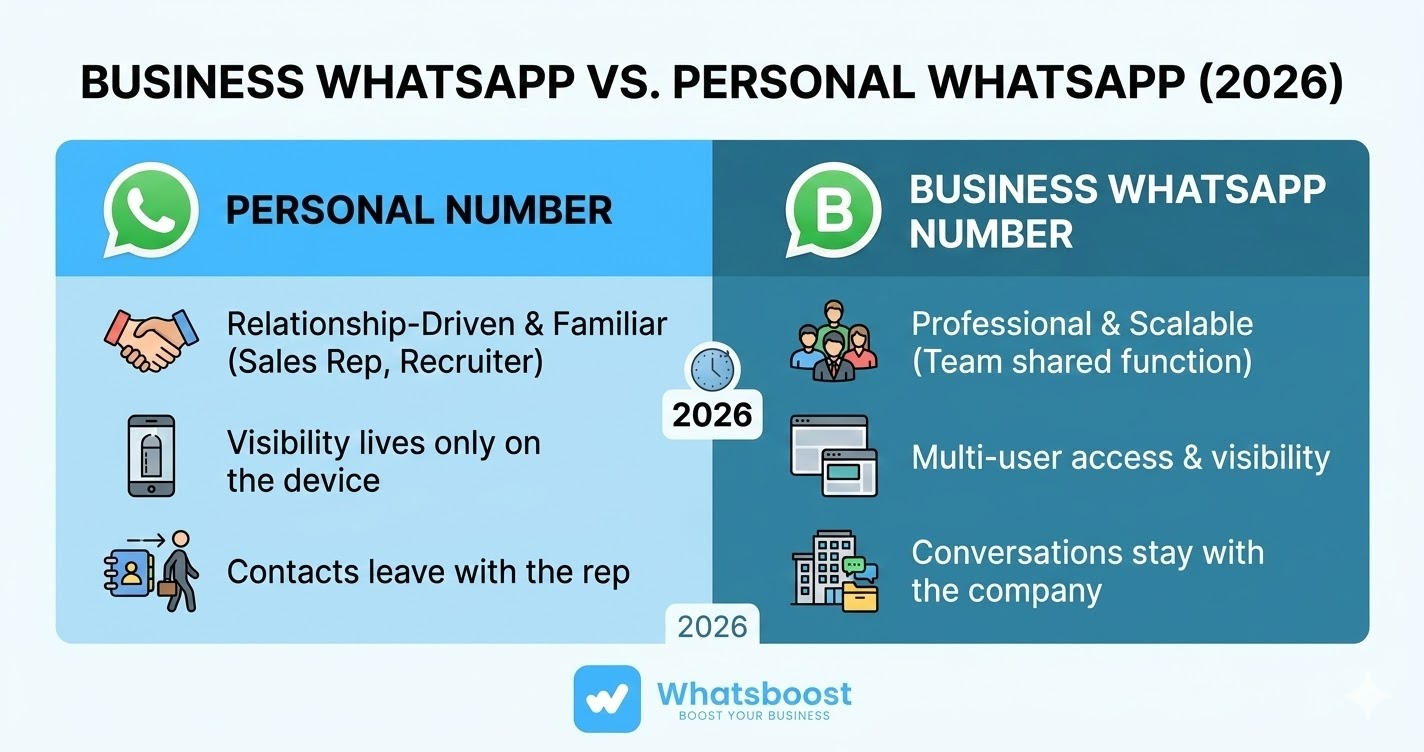 Business WhatsApp number or personal number — which is right for your team in 2026? Discover the key differences, use cases, limitations, and how Whatsboost bridges the gap.