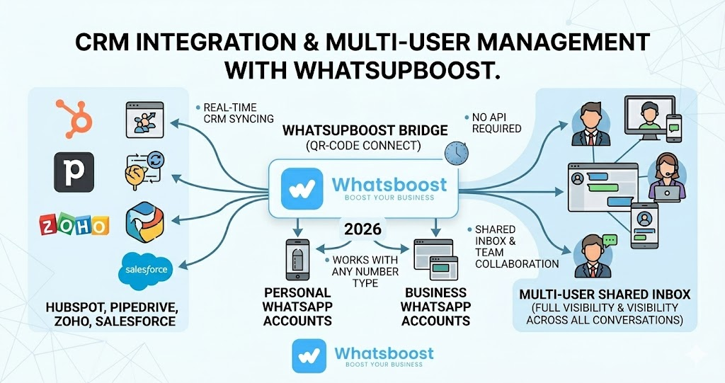 Whatsboost solves this problem directly. You can connect a personal WhatsApp number to your CRM without switching to WhatsApp Business and without requiring the WhatsApp Business API. The rep keeps their number and their client relationships. The business keeps the full conversation history in the CRM, automatically synced in real time.