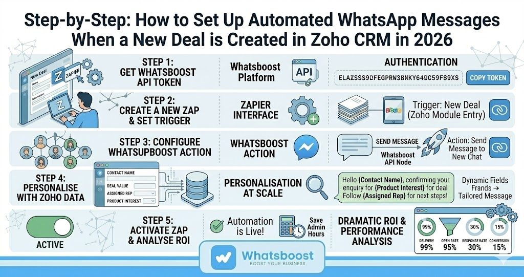 Learn how to automatically send WhatsApp messages when a new deal is created in Zoho CRM in 2026. A step-by-step guide using Whatsboost to streamline your sales communication.
